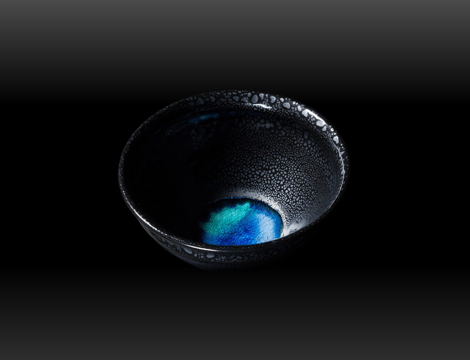 石垣焼は、陶器とガラスの融合により、 沖縄の海を彷彿とさせる焼物です。 伝統美の素晴らしい『油滴天目』に 独自の技術で生み出す『石垣ブルー』は、一度目にすると虜になる魅惑的な作品です。 その海の景色は、天然の鉱石からの成分を利用して、エメラルドグリーンやオーシャンブルーへ自然発色させる事で、生まれる唯一無二の輝きです。