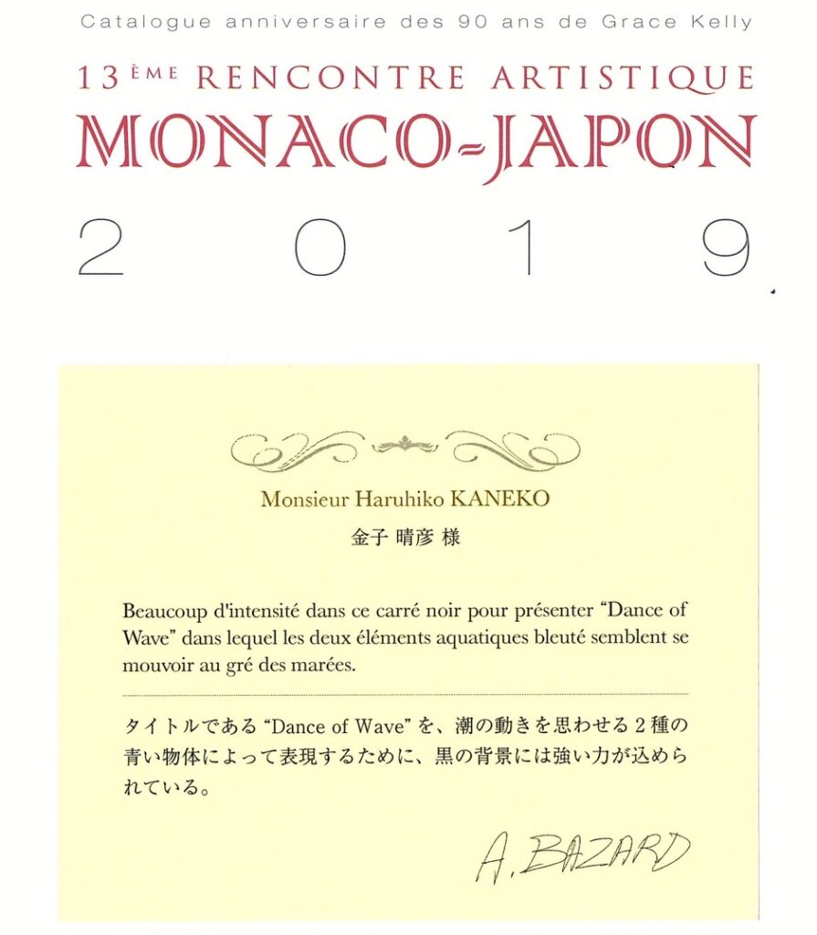 国立レニエ3世大公記念館にて「グレース・ケリー生誕90周年記念 第13回モナコ・日本芸術祭2019」が開かれました。今回、グレースケリー生誕90周年記念という特別な展示会で、Grace Patricia Kelly公妃とAlbert Alexandre Louis Pierre Grimaldi大公の為に作品を捧げたい思いで出品いたしました。モナコ公国での出品はこれが最後となりましたが、モナコ公国文化庁、モナコ公国政府観光会議局から、「グランド アヴェニール賞(輝く未来賞)」も頂き、モナコ公国に感謝です。また見ぬ国々へ、未来へ挑戦いたします。