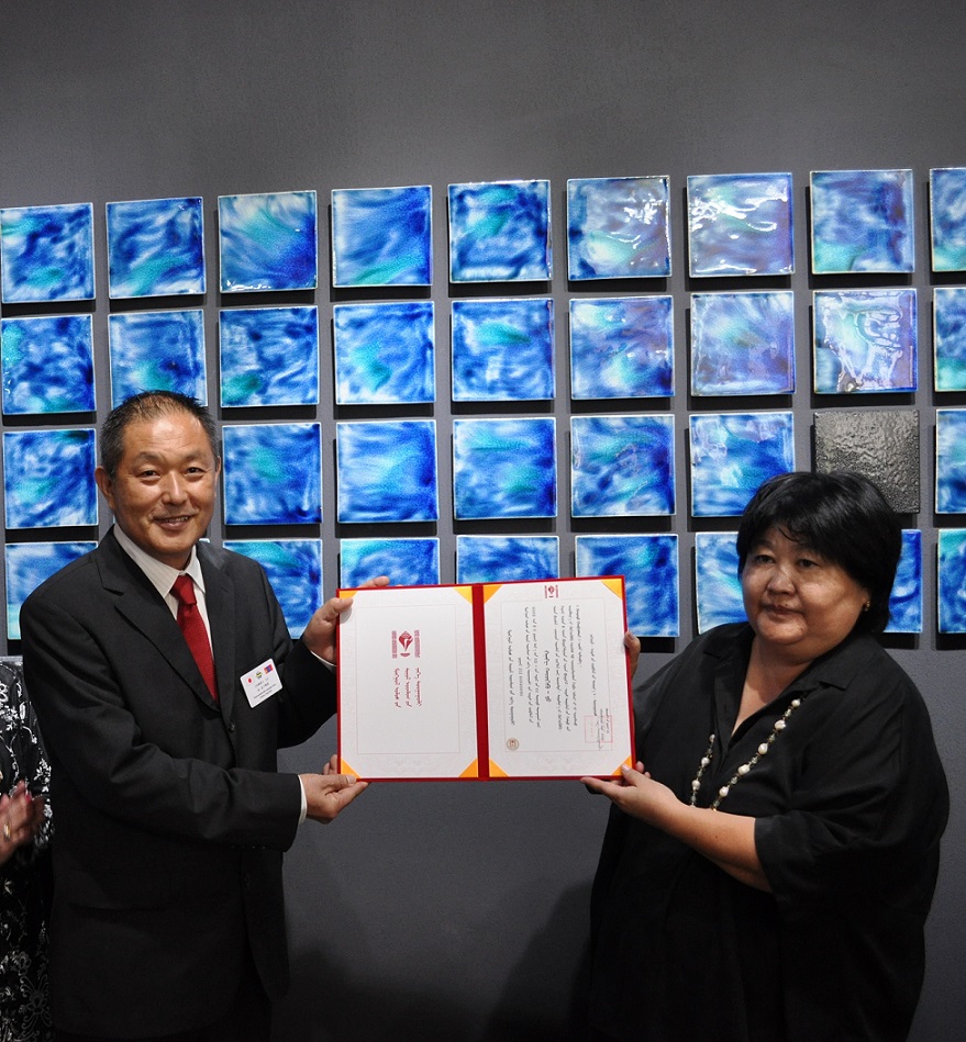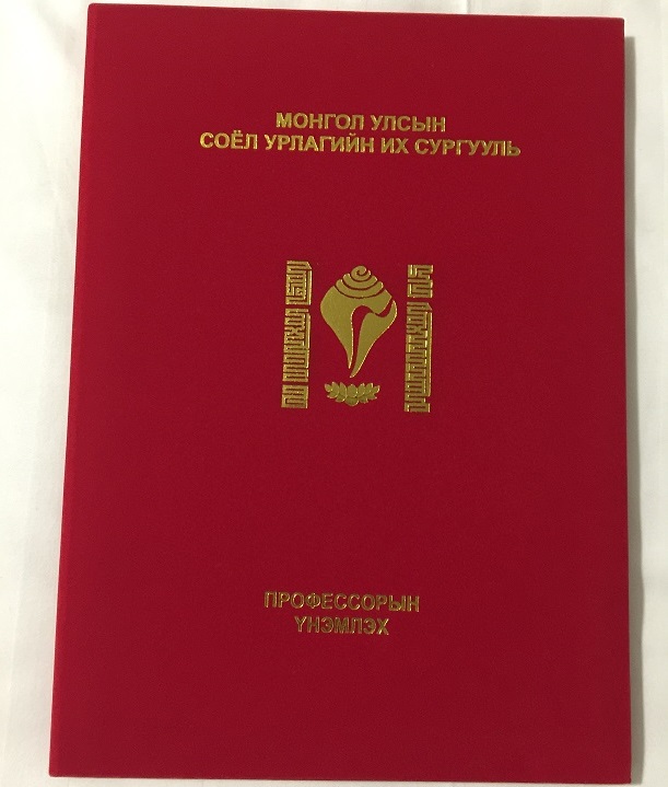 作品寄贈式の途中に、ソニントゴス学長よりサプライズがありました。「ガラスと陶器の融合」という新しいカテゴリーの第一人者として、またモンゴルに陶芸の新しい風を起こした芸術家として、名誉教授(honorary professor)の称号を授与していただきました。
