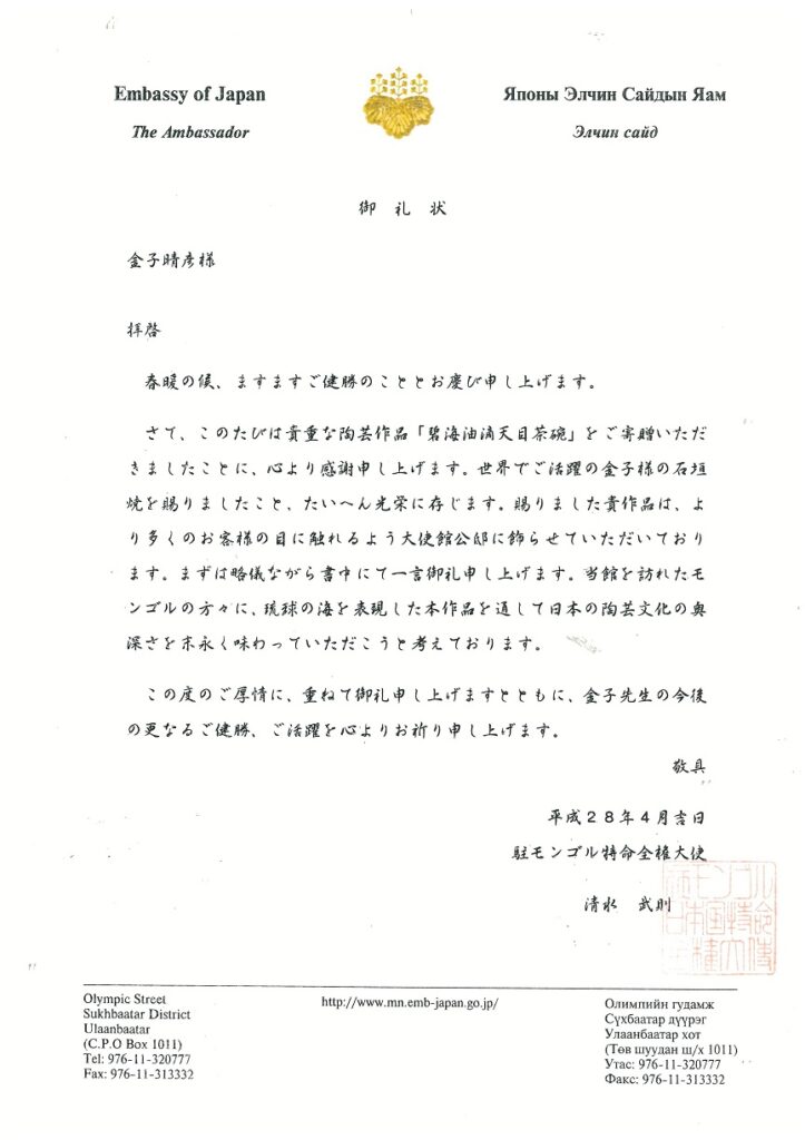 駐モンゴル日本国大使館に「碧海油滴天目茶碗」を寄贈致しました。