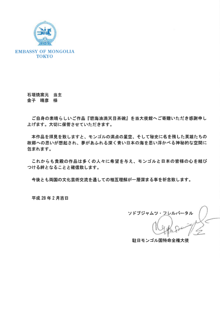 駐日モンゴル国大使館に「碧海油滴天目茶碗」を寄贈致しました。